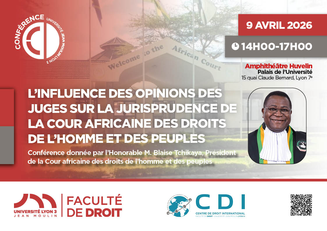 Le Centre de droit international de l’Université Jean Moulin Lyon 3 organise, le 9 avril 2026, une conférence à l’occasion du lancement du projet de recherche intitulé « Influence des opinions et déclarations des juges sur la pratique de la Cour Africaine des Droits de l’Homme et des Peuples ».