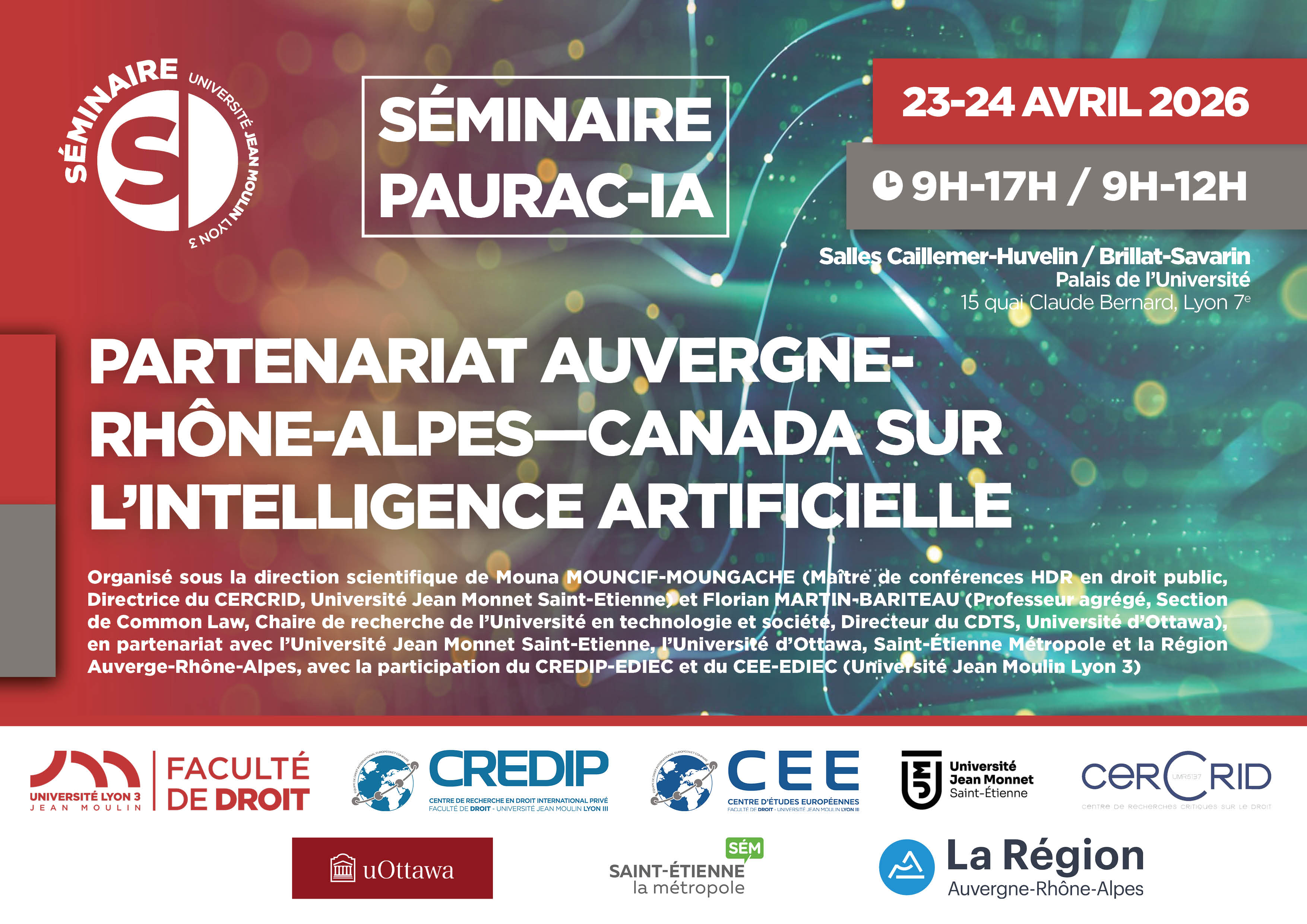 Organisé sous la direction scientifique de Mouna MOUNCIF-MOUNGACHE (Maître de conférences HDR en droit public, Directrice du CERCRID, Université Jean Monnet Saint-Etienne) et Florian MARTIN-BARITEAU (Professeur agrégé, Section de Common Law, Chaire de recherche de l’Université en technologie et société, Directeur du CDTS, Université d’Ottawa), en partenariat avec l’Université Jean Monnet Saint-Etienne, l’Université d’Ottawa, Saint-étienne Métropole et la Région Auverge-Rhône-Alpes, avec la participation du CREDIP-EDIEC et du CEE-EDIEC (Université Jean Moulin Lyon 3)