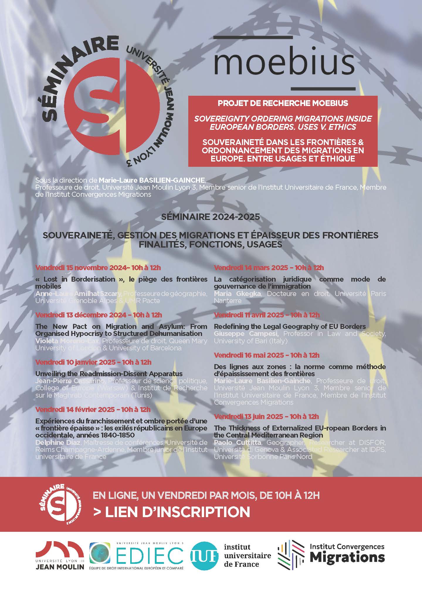 Le projet de recherche MOEBIUS - Sovereignty ordering migrations inside European borders. Uses v. ethics - est mené au titre de la délégation de Marie-Laure BASILIEN-GAINCHE à l'Institut Universitaire de France comme membre senior sur une chaire fondamentale à dater du 1er octobre 2023. Les actualités du projet de recherche MOEBIUS sont présentées sur la page dédiée de son site internet : https://sites.google.com/site/marielaurebasiliengainche/activites/actualit%C3%A9s-du-projet-moebius